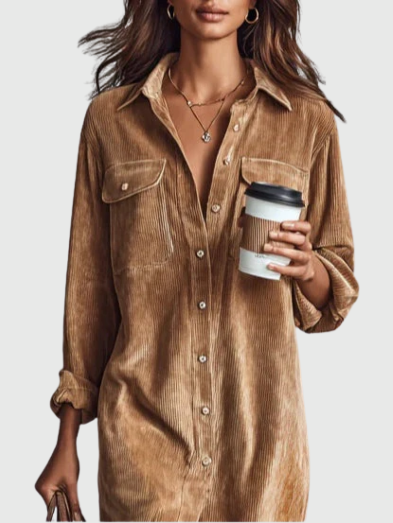 Une robe midi confortable et élégante, confectionnée en velours côtelé doux, avec une silhouette ample, des poches doubles sur la poitrine et une classique fermeture avant à un seul bouton. Parfaite pour un usage quotidien avec une touche de charme rétro.
